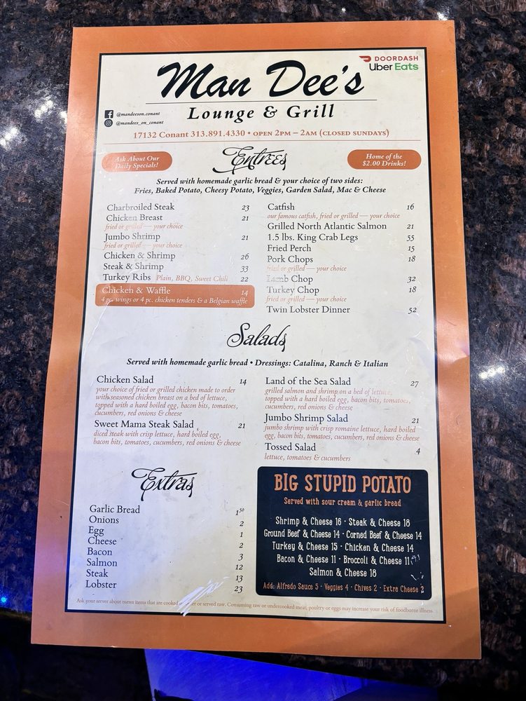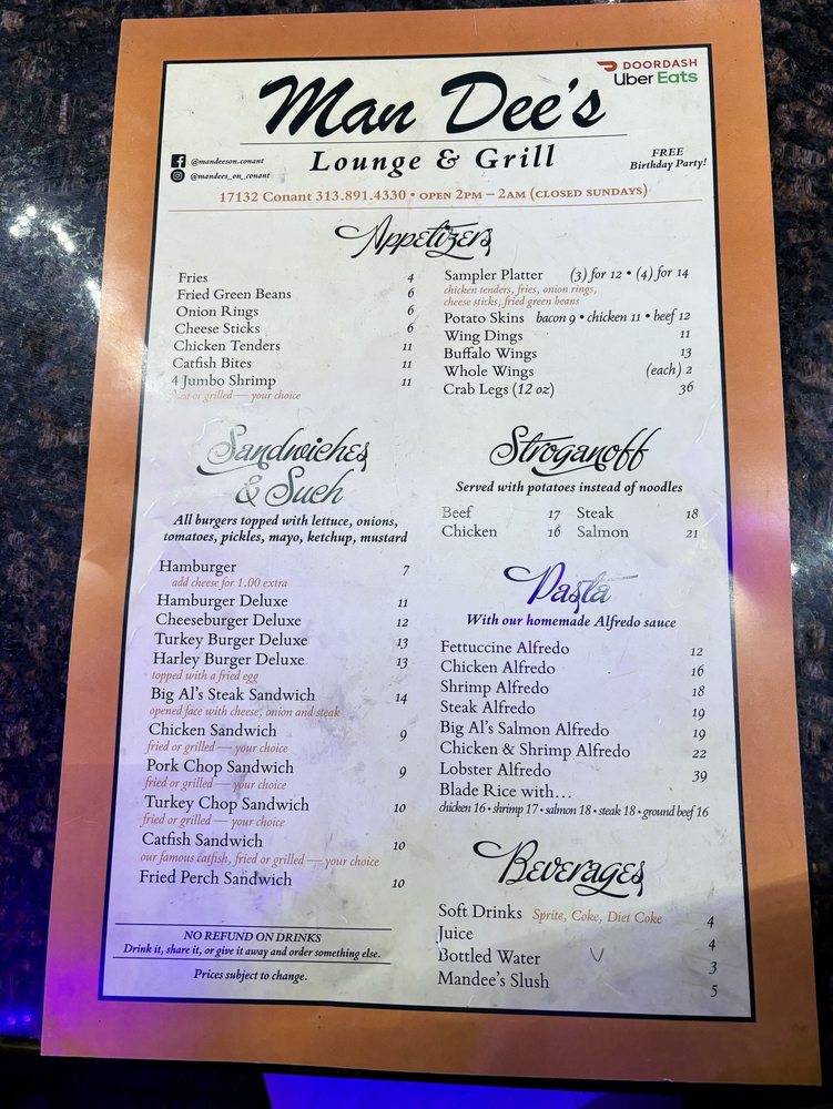 Welcome to Mandee's Jazz Cafe, a hidden gem in Detroit, renowned for its flavorful chicken wings and vibrant atmosphere. Located at 17132 Conant, this establishment pairs exquisite cuisine with a lively jazz ambiance, creating the perfect backdrop for an enjoyable evening. The menu features a variety of mouthwatering options, including the Harley Burger Deluxe topped with a fried egg and the famed Buffalo Wings Dings, perfect for sharing with friends in their spacious outdoor seating area.